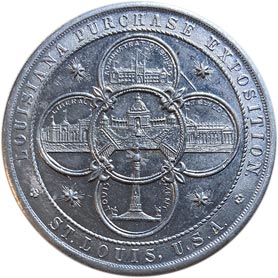 Obv. Five small conjoined circular panels, edifice in each, a star at upper l. and r. and at lower l. and r.--all within large center beaded circle; outside above Louisiana Purchase Exposition.; below * St. Louis, U. S. A. *; beaded border.