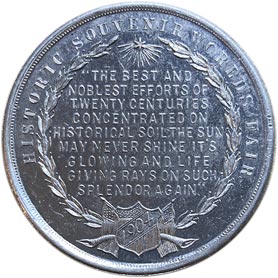 Rev. Within large center wreath "The Best and / Noblest Efforts of / Twenty Centuries / Concentrated on / Historical Soil. The Sun / May Never Shine It's / Glowing and Life / Giving Rays on Such / Splendor Again"; crossed flags and shield below, on shield 1904; above all, around Historical Souvenir World's Fair; beaded border.