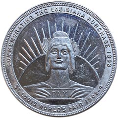 Obv. Female bust facing, rays above, both hands holding ribbon across chest bearing PAX--all within center circle; outside, above Commemorating the Louisiana Purchase 1803; below St. Louis World's Fair 1903-4; beaded border.