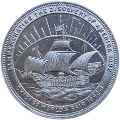 Rev. In center circle is a sailing ship with rays above; outside above Commemorating the Discovery of America 1492; below Chicago World's Fair 1892-3; beaded border.