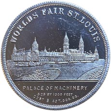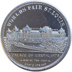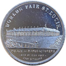 Obv. Edifice; above, around, Worlds Fair St. Louis; below edifice, Palace of Manufacturers / --525 by 1200 Feet-- / Cost $719,000; beaded border.
