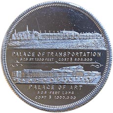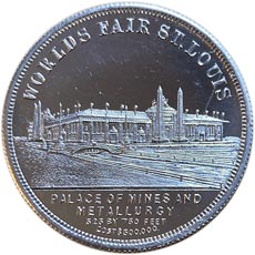 Obv. Edifice; above Worlds Fair St. Louis; below edifice Palace of Mines and / Metallurgy / 525 by 750 Feet / Cost $500,000; beaded border.