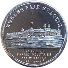 Rev. Edifice and grounds; above, around Hall of Festivals and Central Cascades / Exposition St. Louis 1904; beaded border--(on edge, incuse microscopic Silber .990. Perhaps this was intended to mean .990 silver).