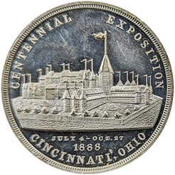 Obv. View of exposition; above, around Centennial Exposition; below, July 4 - Oct. 27 / 1888 / Cincinnati, Ohio