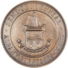 Obv. Within center circle is City Seal; outside, above Semi-Centennial; outside, below • Albany • Burgesses • Corps •; beaded border.