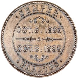 Rev. Within center circle, across is a scroll / Oct. 8, 1833 / scroll / Oct. 8, 1883 / scroll; outside above • Semper •; outside below • Paratus • (translation: "Always Prepared"); below all, in microscopic incuse text, Tiffany & Co.; beaded border.
