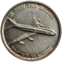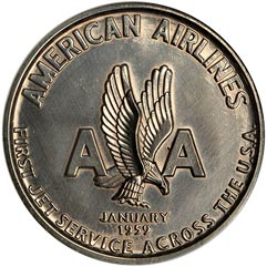 Obv. In center an Eagle, wings spread high, large A each side (Seal of American Airlines); above American Airlines; below eagle January / 1959; below around First Jet Service Across the U. S. A.