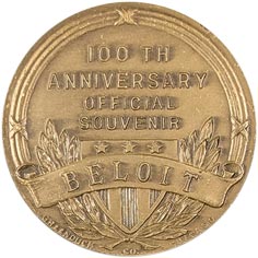 Rev. Across 100th / Anniversary / Official / Souvenir; below is Beloit on ribbon across shield and open wreaths; above all, around are ornamental designs; at bottom edge, microscopic Greenduck Co Chicago.