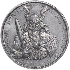 Obv. King Brian Boru facing, holding sword in r. hand; above around, in Celtic Brian Boroime Ard Rig Eirinn (Brian Boru, High King, Erin); below MXIV-MCMX (1014-1910); microscopic H above dates; beaded border.