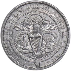 Rev. An involved Celtic design in form of a shamrock; in upper leaf (or circle) is sunburst of ancient flag of Ireland; in lower l. leaf is a ruined abbey and round tower; in lower r. leaf is miniature of a Celtic cross; superimposed on center is spread-winged American eagle resting talons on an Irish harp, below is a reclining Irish wolfhound--all within large decorated circle; outside, below circle, supporting stem of shamrock and base of harp, is the "red hand" of the arms of Ulster; hand separates AON (one) and Croin. (crown); legend around, in Celtic, Muintir Na H'eirann in Ameri'cea (the people of Ireland in America); beaded border.