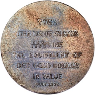Obv. In seven straight lines, 776 1/3 / Grains of Silver / 900/1000 Fine / The Equivalent of / One Gold Dollar / in Value / July 1896 UNIFACE.