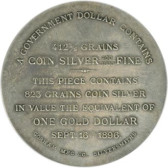 Obv. In nine lines, first and last curved, others straight, A Government Dollar Contains / 412 1/2 Grains / Coin Silver 900/1000 Fine / This Piece Contains / 823 Grains Coin Silver / In Value the Equivalent of / One Gold Dollar / Sept. 16th 1896. / Gorham Mfg. Co., Silversmiths. No rim.