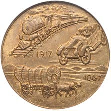 Obv. Train, automobile and covered wagon; below train and to l. of auto 1917; below auto and to r. of covered wagon 1867