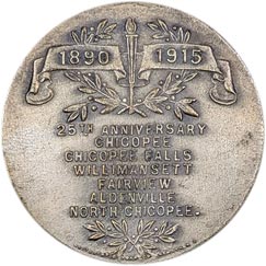 Rev. Torch in center of ribbons and wreath; to l. an ribbon 1890, to r. on ribbon 1915; below all 25th Anniversary / Chicopee / Chicopee Falls / Willimansett / Fairview / Aldenville / North Chicopee; small wreath below; microscopic Whitehead & Hoag Co Newark N. J.