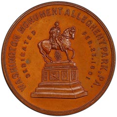 Obv. Statue of Washington mounted on horse; to l. Dedicated; to r. Feb. 23. 1891; above all, around Washington Monument Allegheny Park, Pa.; beaded border.