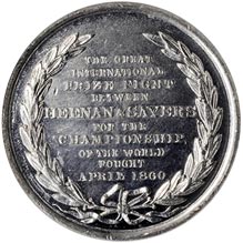These medals commemorate one of famous bare-knuckle heavyweight championship bouts. John C. Heenan, born Troy, NY, moved to California; called Benicia Boy, won first clear claim to American title. He journeyed to England, there met world champion Tom Sayers. Latter born Brighton, England; bricklayer by trade; won championship 1857. Heenan-Sayers fought at Farnborough, April 17; called "most famous" in English prize ring history; lasted over 2 hours; ended in 42-round "draw" when crowd swarmed ring following injury to Sayers' arm. Latter then retired permanently from boxing.
