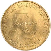 Rev. In center is map of Georgia; across map Savannah / Ga.; above, around International Monetary Conference; below map, around * Mar. 8 to 22, 1946; microscopic Osborne Register Co. Cincinnati near bottom edge.