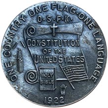 Obv. Scroll, on which are cross, Constitution / of the / United States, Holy Bible and American Flag; hand between Bible and flag; above scroll, O.S.F.K.; below in exergue, 1922: to l., bundle of sticks; legend around, One Country • One Flag • One Language