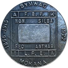 Rev. Square design, small squares in corners contain A, K, I and A; between top corner squares F.B.P.; between bottom squares L.F.E.; above rectangle in square center Non Silba; below rectangle Sed Anthar; above square Symwao; to r. 1922; below Mokana; to l., 1866-1915
