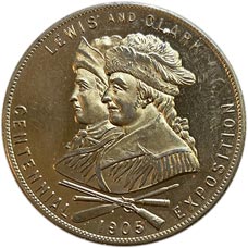 Obv. Conjoined busts l.; above Lewis and Clark; below busts are crossed rifle, oar and telescope; below, around Centennial 1905 Exposition; beaded border.