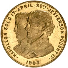 Obv. Conjoined busts l. (Napoleon and Jefferson); above, around Napoleon Sold It--April 30th--Jefferson Bought It--; below busts 1803; beaded border.