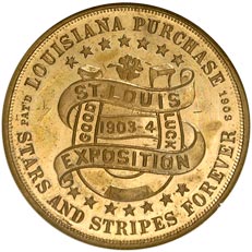 Obv. Involved scene portraying Louisiana Purchase by Uncle Sam from French maiden (?) with Vive La Republique on ribbon at top, 1803 and 1903 in wreaths at upper l. and r. respectively and busts of Bonaparte and Jefferson at lower l. and r. respectively; in large letters, above around Louisiana Purchase Exposition; below 1803 St. Louis 1904