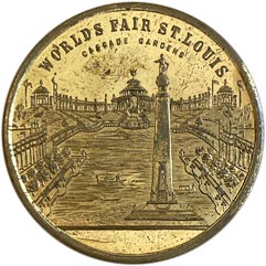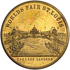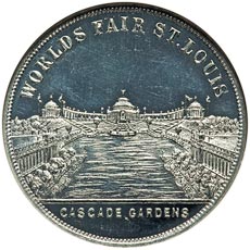 Obv. Gardens and edifice; above Worlds Fair St. Louis; below gardens Cascade Gardens; beaded border.