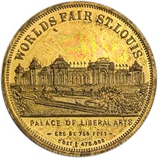 Obv. Edifice; above, around, Worlds Fair St. Louis; below edifice, Palace of Manufacturers / --525 by 1200 Feet-- / Cost $719,000; beaded border.