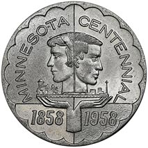 Arcs around entire border enclosing design of four unequal segments, upper l. and lower r. are frosty, other 2 are bright; around, in upper two segments Minnesota Centennial; in lower l. 1858, in lower r. 1958; central design is that of two heads, back to back, female to l. and male to r.; below are two outstretched hands holding items representing agriculture, industry, forests, ore.