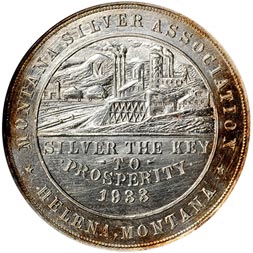 Obv. Mining scene in upper center portion, incused M upon hillside; lower center panel inscribed Silver the Key / to / • Prosperity • / 1933; circle around all; between circle and beaded border, * Montana Silver Association * Helena, Montana