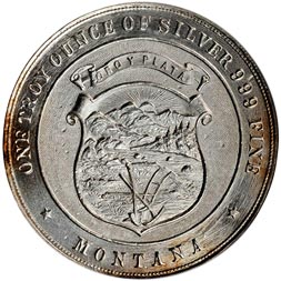 Rev. Modification of Montana State Seal, engraved on shield in bas-relief, with inscription Oro y Plata (Gold and Silver) in scroll above shield; legend above, around, * One Troy Ounce of Silver 999 Fine *; below, Montana