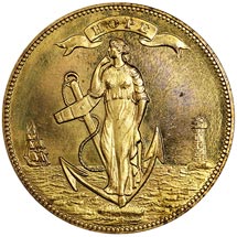 Obv. Full female figure facing part l. standing astride large ship's anchor; in background is ship to l. and lighthouse to r.; above, on ribbon, Hope; beaded border.