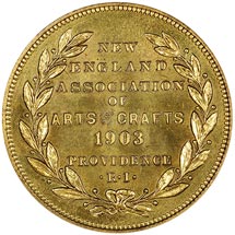 Rev. Within open wreath, across New /England / Association / of / Arts and Crafts / 1902 / Providence / • R • I •; beaded border.