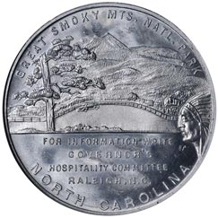 Obv. In upper half are mountains with auto parked in observation area at base; above Great Smoky Mts. Natl. Park; in lower half For Information Write / Governor's / Hospitality Committee / Raleigh, N. C. / North Carolina; at r. border is Indian head in profile.