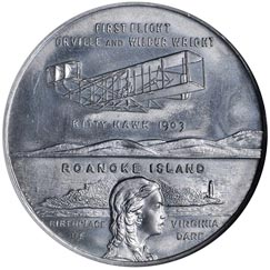 Rev. In upper half is replica of first airplane; above First Flight / Orville and Wilbur Wright; below plane Kitty Hawk 1903; in lower half is female bust facing r. with island in background; above Roanoke Island; to l. of bust Birthplace / of, to r. of bust Virginia / Dare; to l. border, microscopic W. & H. Co.