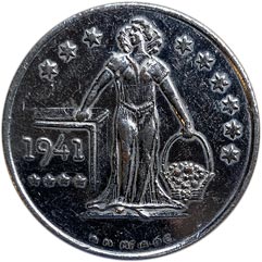 Obv. Standing female figure, 3 stars at l. of head, 6 stars around at r.; l. arm holds basket of fruit, r. hand rests on or holds square shield; on shield 1941, 4 stars below; at bottom edge, microscopic Acme Metal Die.