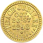 Obv. Angel with star above and cherub facing, angel holding olive branch in right hand, cherub holding caduceus in left hand; to left Peace; to right Jubilee; below 1898; on scroll below all Philadelphia Oct. 26-27; beaded border.