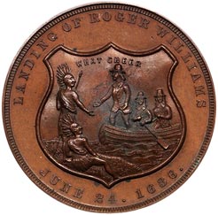 Obv. On raised shield in center is scene depicting landing of Roger Williams; at top of shield What Cheer; outside, above Landing of Roger Williams; below June 24 • 1636 •; beaded border.