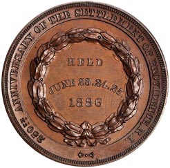 Rev. Within central wreath Held / June 23 • 24 • 25 • / 1886; outside, around 250th Anniversary of the Settlement of Providence, R. I.; beaded border.
