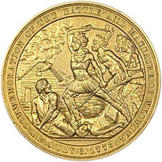 Obv. Scene depicting massacre by Indians--within center circle; outside, around. In commemoration of the battle and massacre of Wyoming. July 3. 1778.