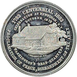 Obv. Edifice in center; above, around Celebration at Newburgh, N. Y. / October 18th; below edifice, microscopic A. Demarest, Sc. N. Y.; upper border legend 1783 -- Centennial -- 1883; lower border legend Proclamation of peace, disbandment of the army