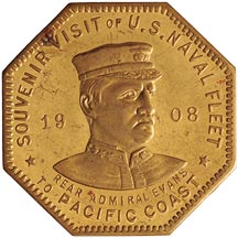 Obv. Bust, in Naval uniform, facing to r.; to l. 19, to r. 08; above bust, around, Souvenir Visit of U.S. Naval Fleet; below bust, around, Rear Admiral Evans / * To Pacific Coast *; beaded border.