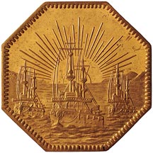 Rev. Three battleships, setting sun with rays in background; beaded border.