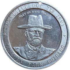 Obv. Male bust facing front; above, around "Let Us Have Peace"--all within beaded circle; outside, above around Unveiled Oct. 7th 1891; below, around * Lincoln Park Chicago *