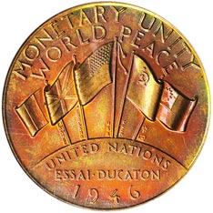 Obv. Flags, l. to r., of France, England, United States, U.S.S.R. and National China (the Big Five); above, Monetary Unity / World Peace; below, United Nations / Essai • Ducaton / 1946. At the base of each flag is written the nation with China being written in Chinese characters.