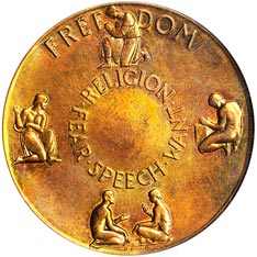 Rev. Four allegorical figures around (at positions of 12, 3, 6 and 9 o'clock) representing the Four Freedoms; above, Freedom; in center, around, Religion • Want • Speech • Fear •