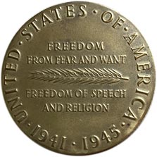 Rev. In upper center, torch and wreath; above around, Victory Medal; below torch, Four Freedoms / Freedom of Speech / Freedom of Worship / Freedom from Fear / Freedom from Want