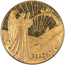Obv. Winged figure of Peace, r., in outstretched r. hand, holds olive branch over battlefield and faces rising sun in background; small cannon to lower r.; near bottom edge, Peace.