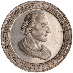 Obv. Within circle, bearded bust, l.; outside, below * Discoverer 1492 *; outside, above Christopher Columbus