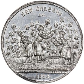 Obv. Pelican on nest, around **** Union **** Confidence **** and **** Justice--all within beaded central circle; outside, around Industrial and Cotton Centennial Exposition New Orleans.